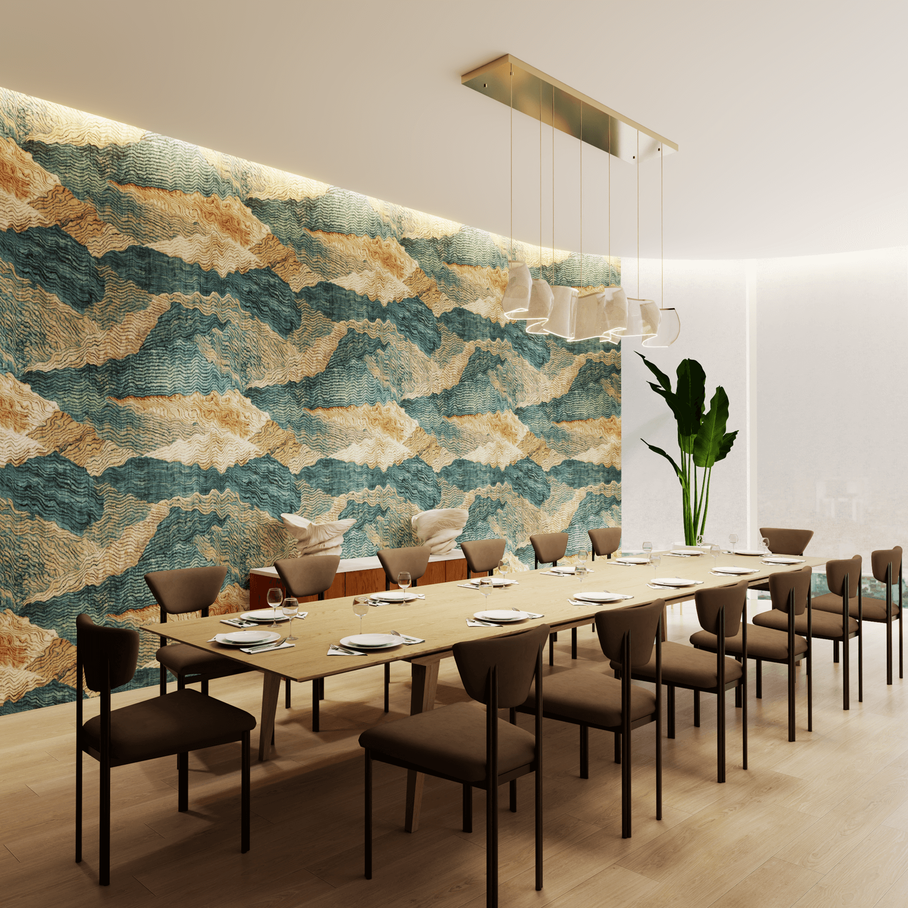 Faced with a client brief that called for a neutral palette without veering into plainness, I approached the dining room design with a focus on warmth, texture, and quiet sophistication. We selected simple, sculptural furniture in natural walnut to ground the space with organic richness, paired with minimal artwork to maintain visual clarity.