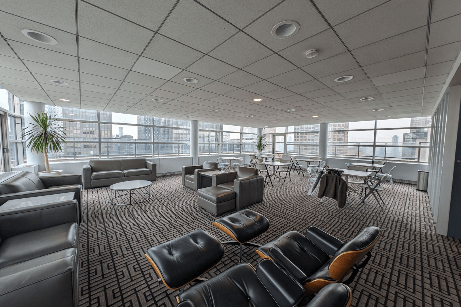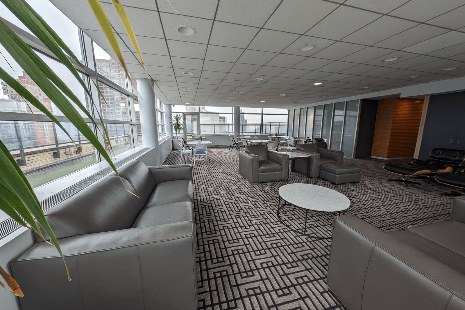 The entertainment zone featured two modular sofas, easily reconfigured to suit residents’ needs. This flexibility allowed the lounge to be divided into distinct sections, giving individuals a sense of privacy while still fostering community. Along the northern wall, a custom banquette added generous seating. Because drilling into the concrete subfloor was not possible, we integrated additional electrical outlets discreetly into the banquette’s floorboard, ensuring functionality without compromising design. The result is a modern, adaptable space – one that balances comfort, utility, and elegance – designed to meet the evolving needs of residents for years to come.