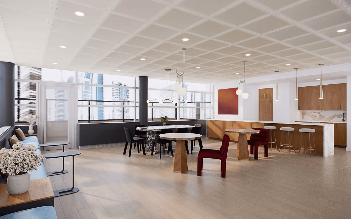 Studio IRHA envisioned a versatile environment- one that could seamlessly accommodate working, reading, or hosting gatherings of varying sizes and age groups. To achieve this, we began by opening up the enclosed kitchenette and removing the adjacent closet, transforming it into a recessed entertainment nook. An open kitchen island was introduced to encourage effortless entertaining, while a dining table provided additional seating for larger parties. Thoughtfully designed with concealed outlets, the dining table could double as a collaborative workspace or serve as a communal hub during board meetings.